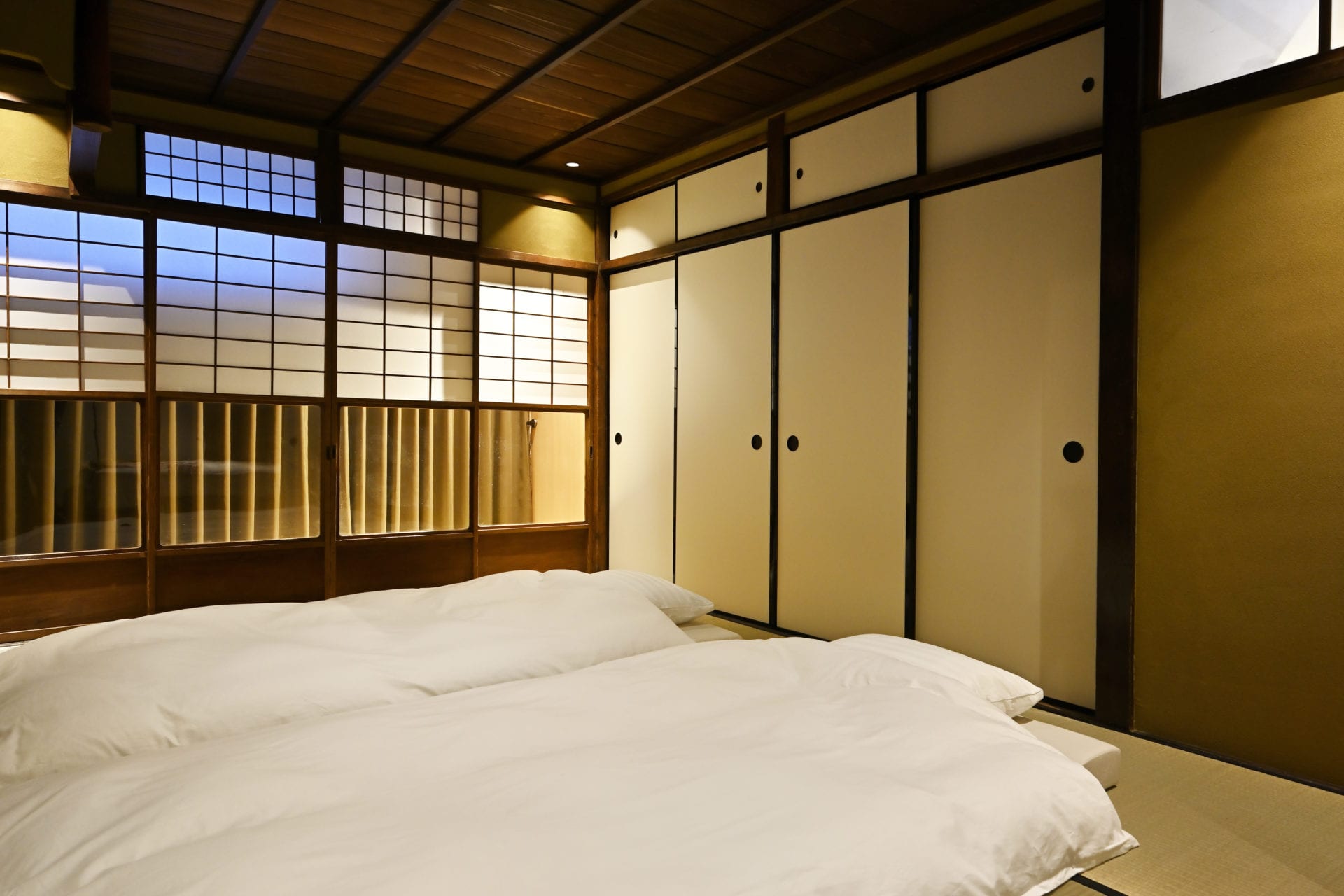 面向庭院的两间“内室”房间铺上被褥就可用作卧室。提供有“匠的顶级床垫”。连同主卧室,最多可住宿9位客人。